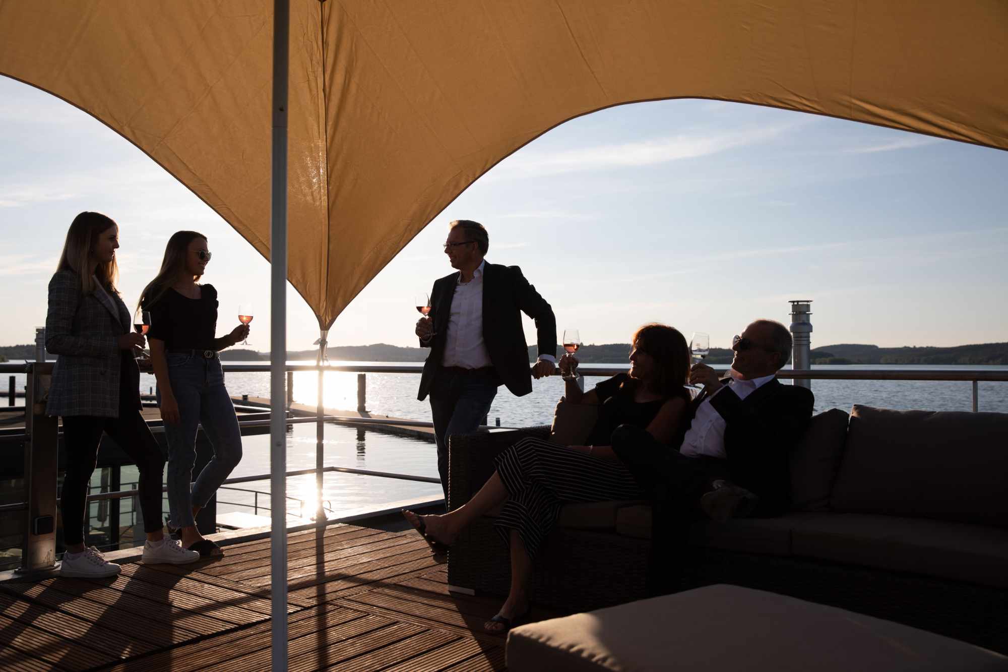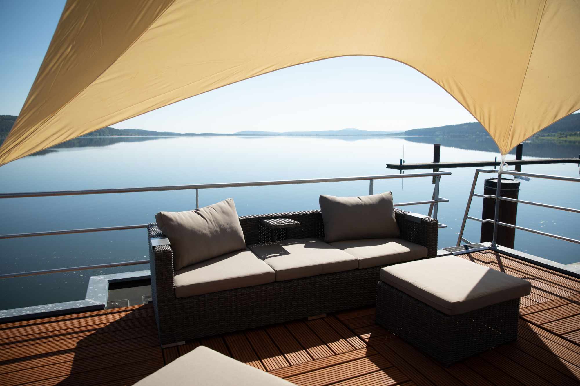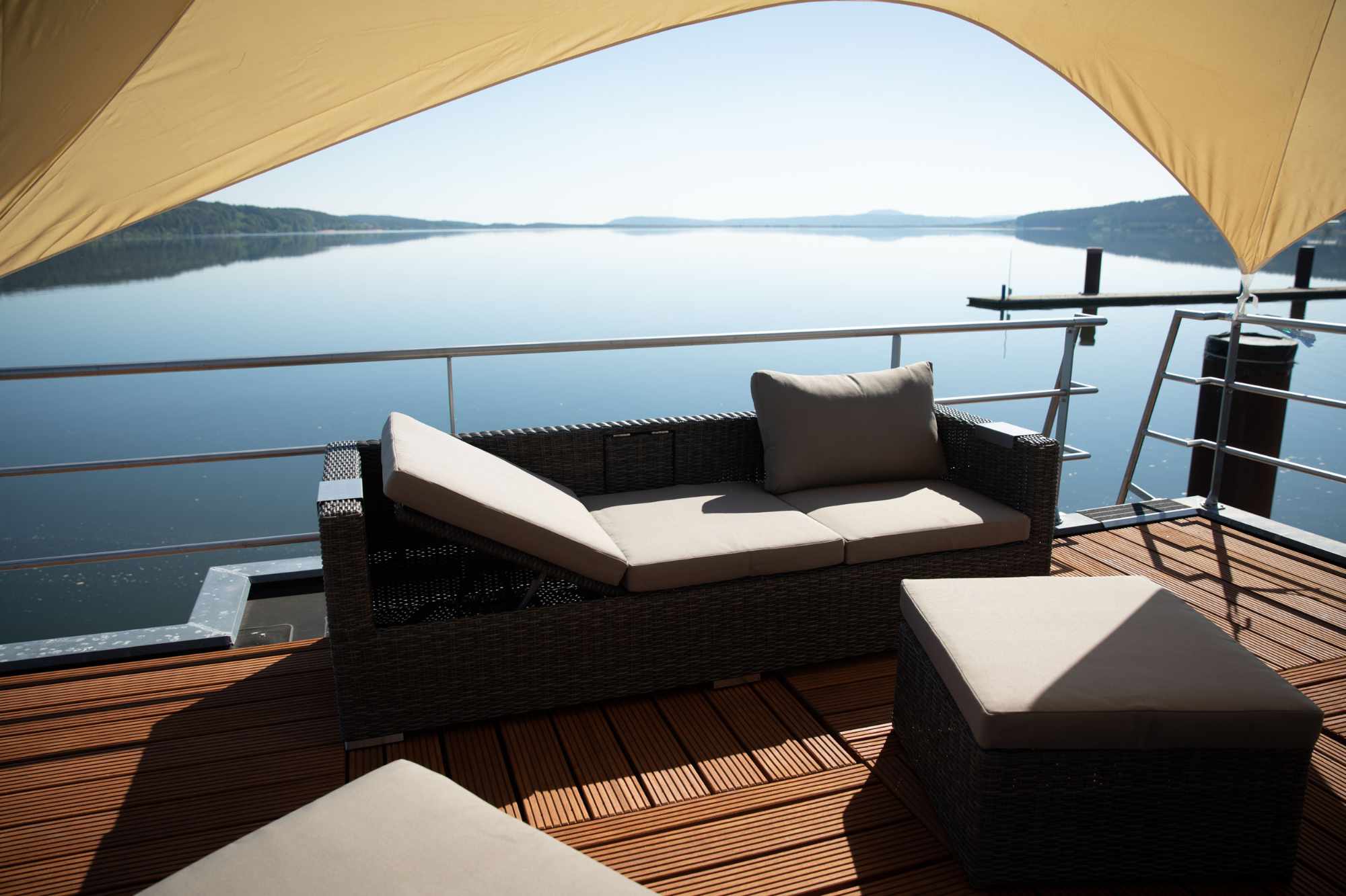 Große Schiebetüren im Wohnzimmer verbinden innen und außen nahtlos. Was gibt es Schöneres, als im Sommer den Tag mit einem Frühstück direkt am Wasser zu beginnen? Anschließend lädt das Oberdeck zum ungestörten Sonnenbaden ein. Von der unteren Terrasse gelangen Sie über eine Leiter zum Abkühlen ins Wasser. Ob oben oder unten, abends können Sie bei einem Sundowner die Stille und einen faszinierenden Sonnenuntergang genießen. Aber auch zu anderen Jahreszeiten lohnt sich der Aufenthalt auf dem Oberdeck. Denn hier haben Sie einen grandiosen 360-Grad-Rundumblick und können sich den Wind um die Nase wehen lassen.