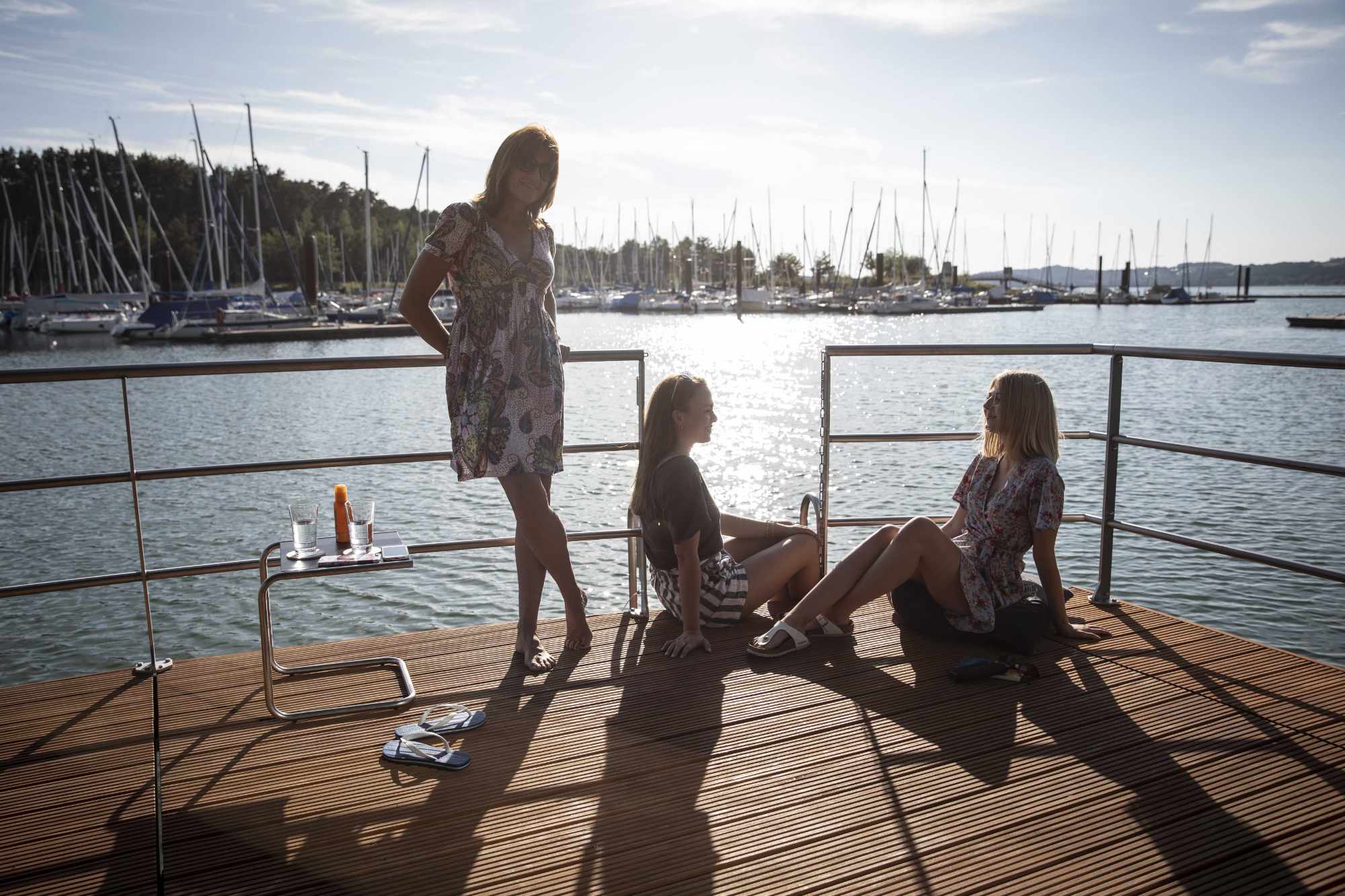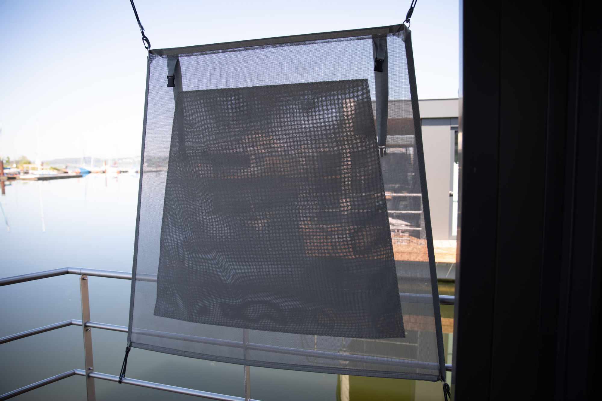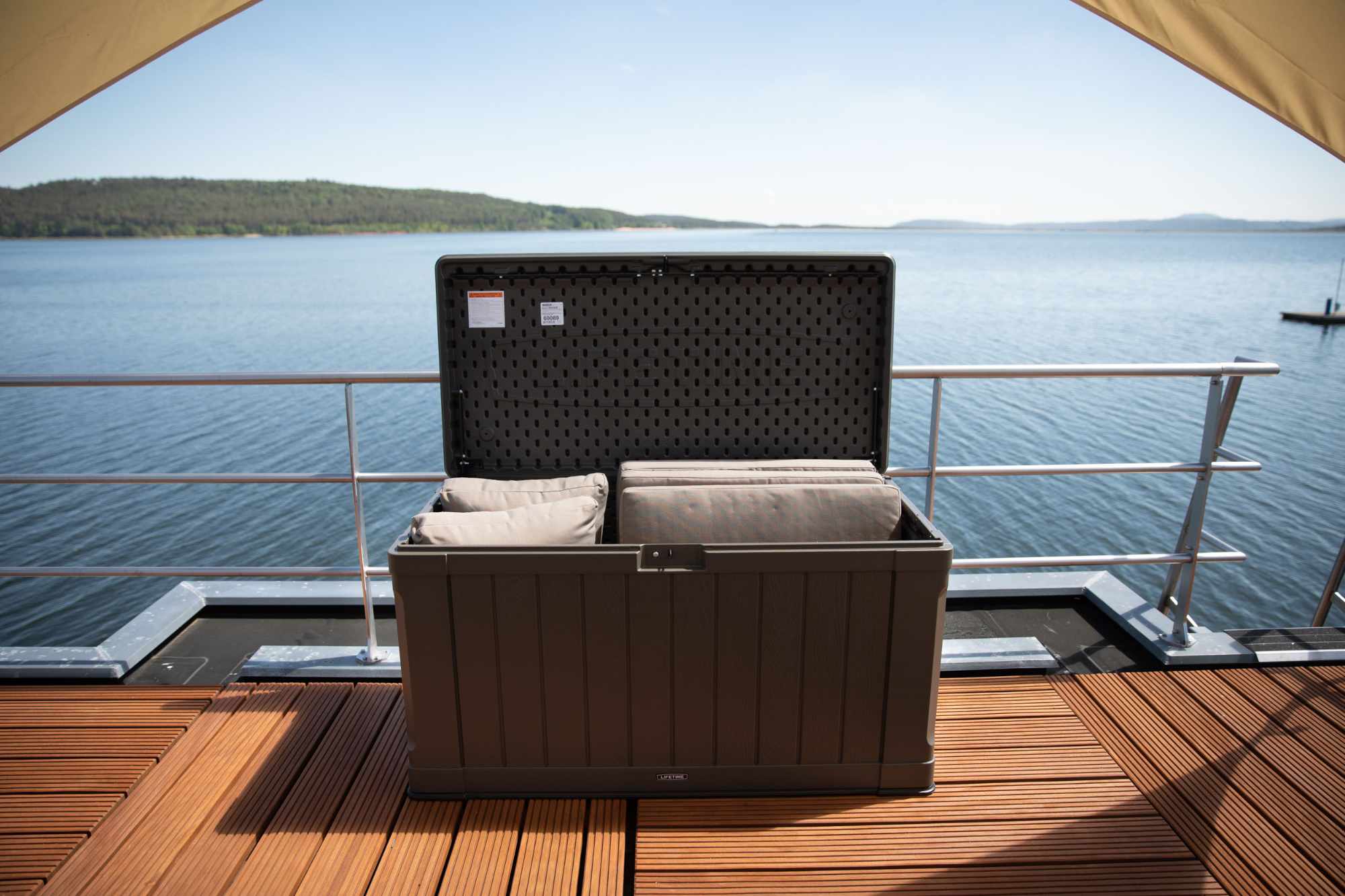 Große Schiebetüren im Wohnzimmer verbinden innen und außen nahtlos. Was gibt es Schöneres, als im Sommer den Tag mit einem Frühstück direkt am Wasser zu beginnen? Anschließend lädt das Oberdeck zum ungestörten Sonnenbaden ein. Von der unteren Terrasse gelangen Sie über eine Leiter zum Abkühlen ins Wasser. Ob oben oder unten, abends können Sie bei einem Sundowner die Stille und einen faszinierenden Sonnenuntergang genießen. Aber auch zu anderen Jahreszeiten lohnt sich der Aufenthalt auf dem Oberdeck. Denn hier haben Sie einen grandiosen 360-Grad-Rundumblick und können sich den Wind um die Nase wehen lassen.