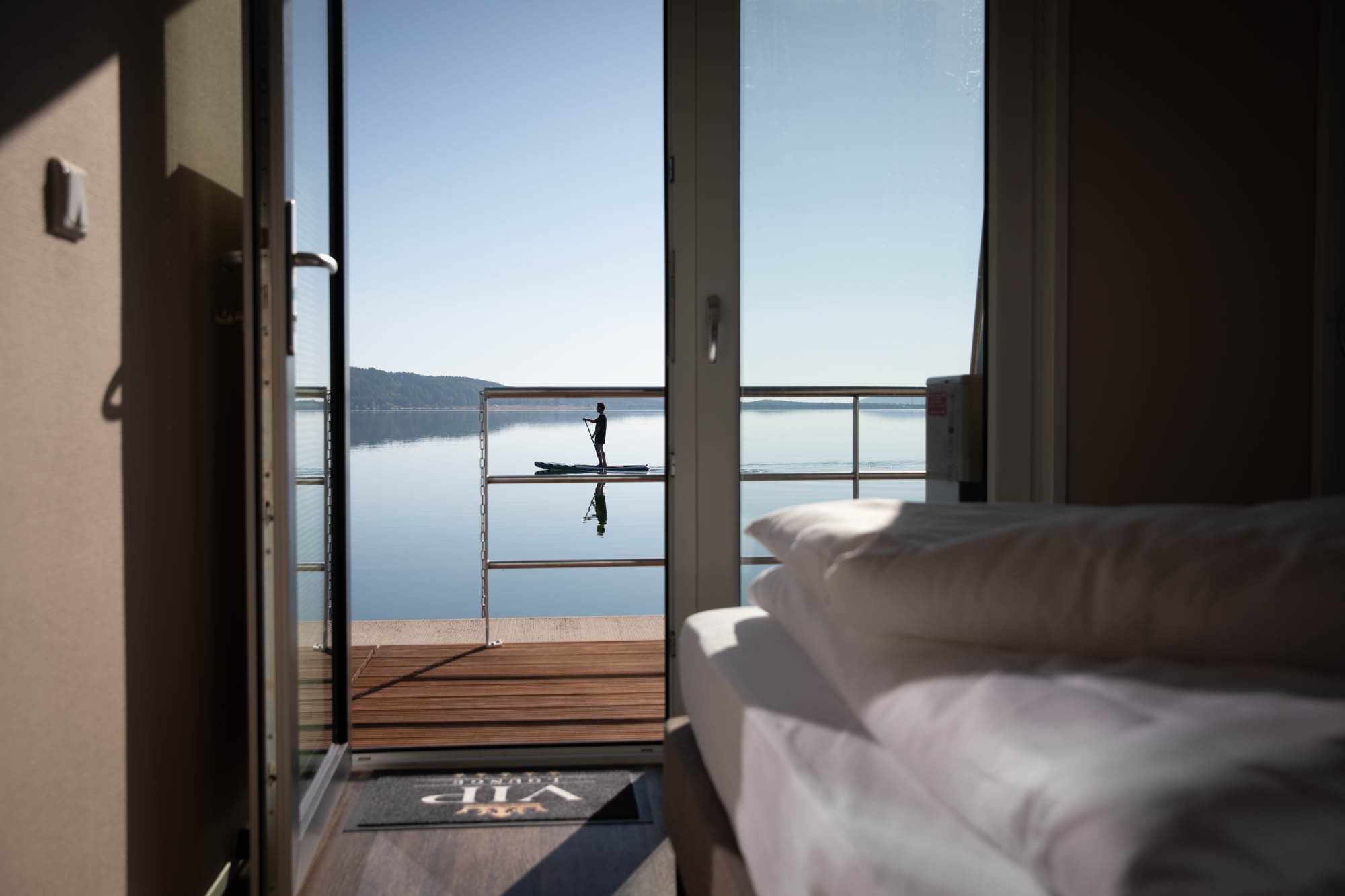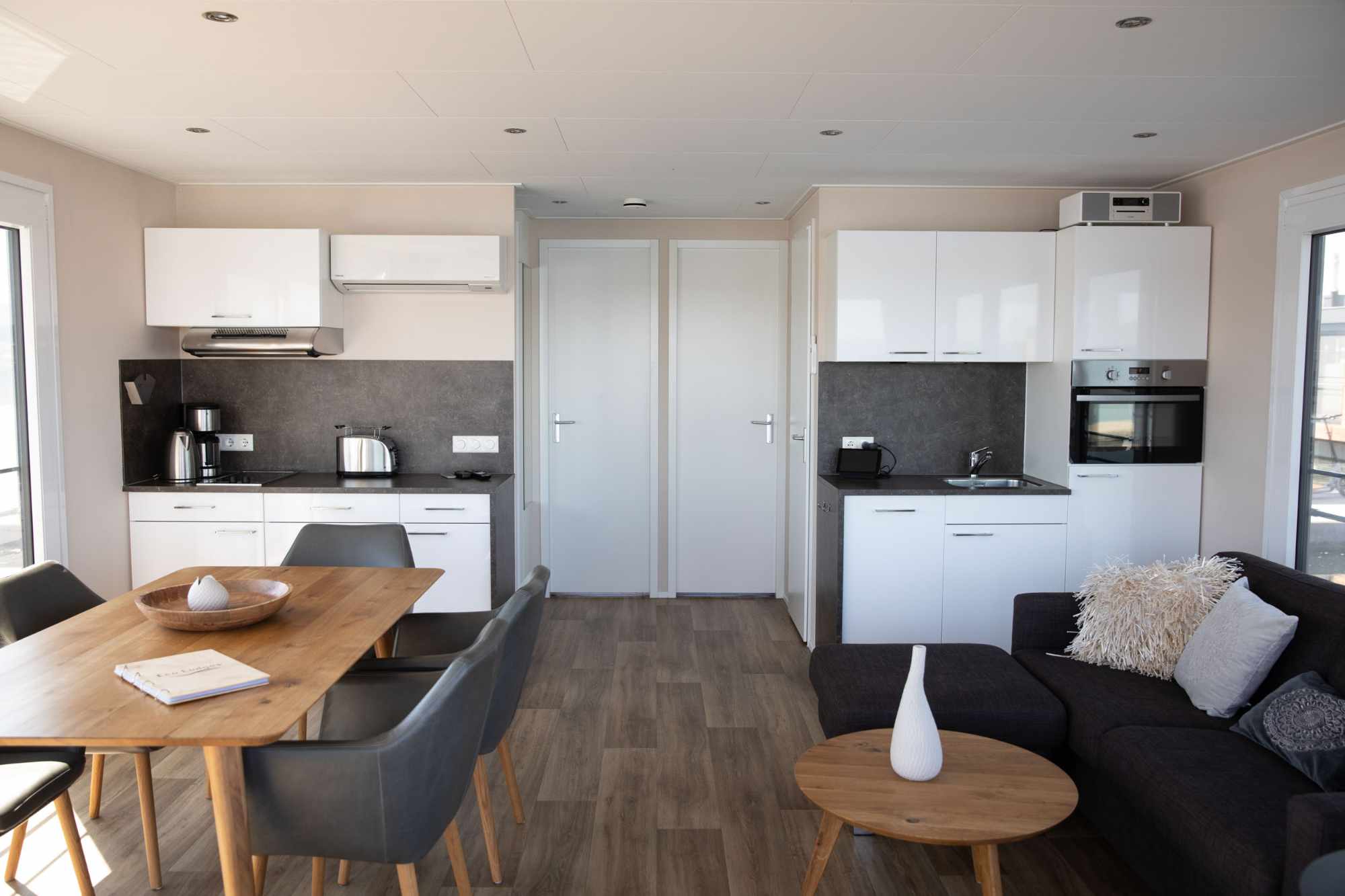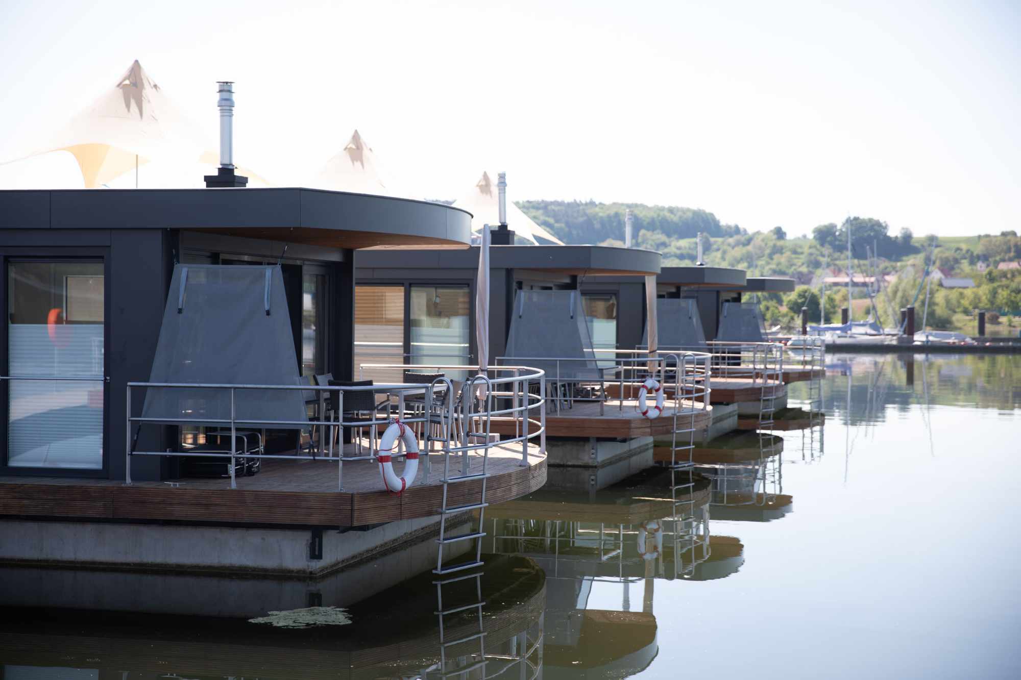 Jede Wasservilla ist innen wie ein Ferienhaus an Land gestaltet, jedoch befindet sie sich auf dem Wasser und ist fest mit dem Schwimmsteg verbunden. Sturm und Wellengang sind leicht zu spüren, was ein maritimes Gefühl aufkommen lässt. Die Wasservillen besitzen zwei Schlafzimmer, ein Badezimmer mit Dusche und ein separates WC. Das Wohn- und Esszimmer mit knapp 22 Quadratmetern bietet komfortablen Platz zum Entspannen. Aus dem Wohnbereich gelangt man auf die Bugterrasse, die zum Verweilen direkt am Wasser einlädt. Über die Heckterrasse erreichen Sie über eine Leiter die Oberdeck-Dachterrasse mit 25 Quadratmetern, die Ihnen einen grandiosen 360-Grad-Rundumblick bietet.