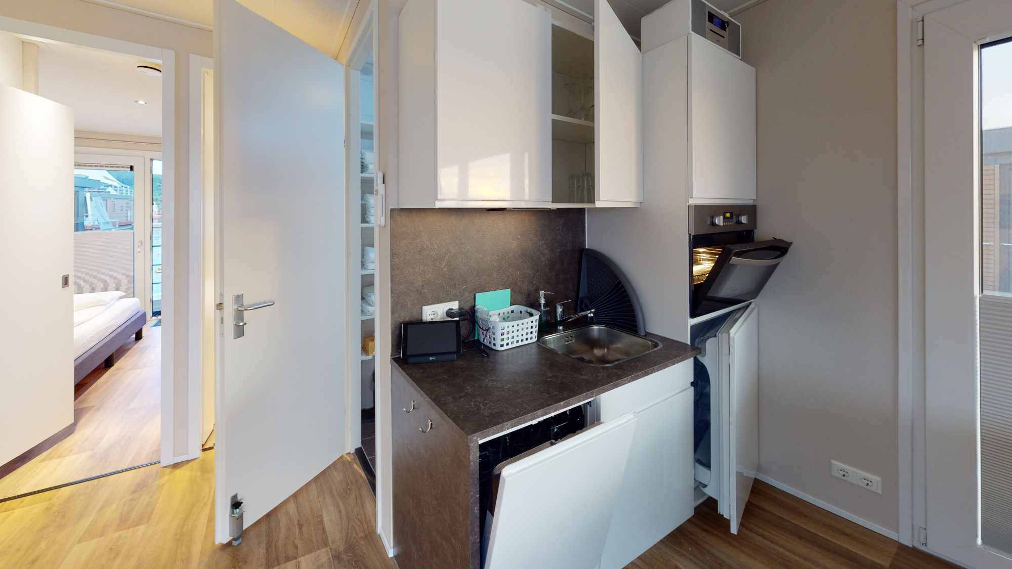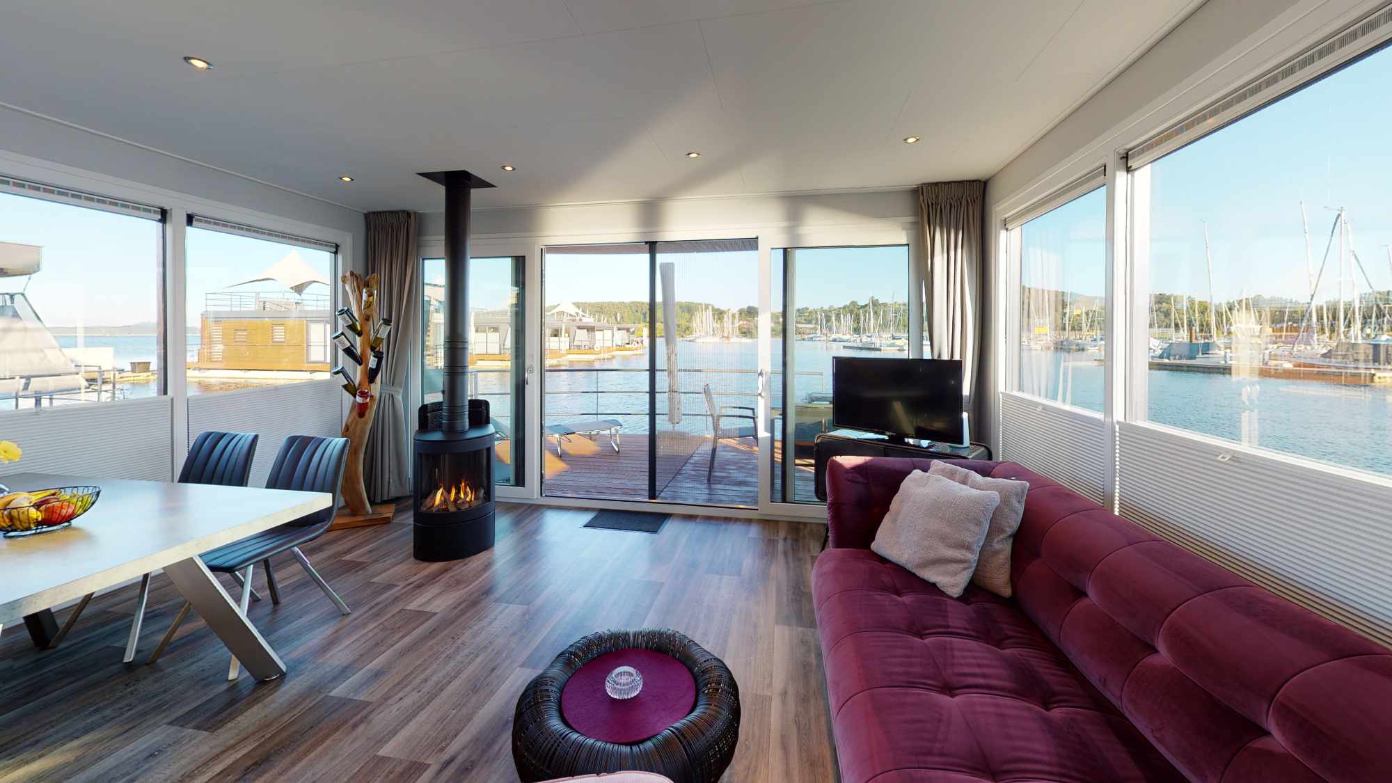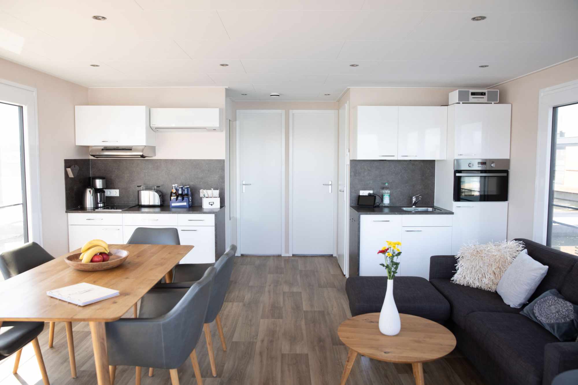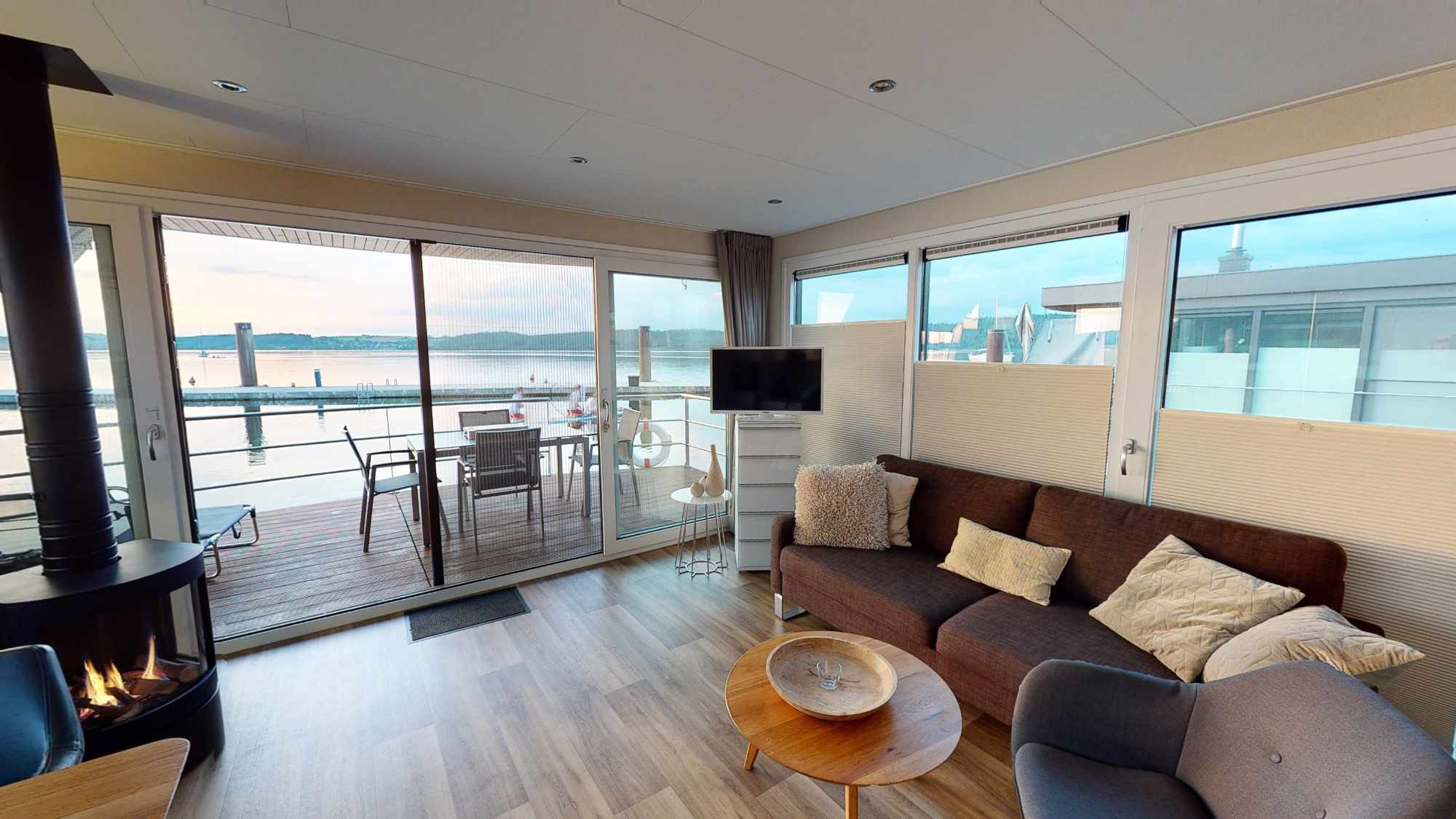 Jede Wasservilla ist innen wie ein Ferienhaus an Land gestaltet, jedoch befindet sie sich auf dem Wasser und ist fest mit dem Schwimmsteg verbunden. Sturm und Wellengang sind leicht zu spüren, was ein maritimes Gefühl aufkommen lässt. Die Wasservillen besitzen zwei Schlafzimmer, ein Badezimmer mit Dusche und ein separates WC. Das Wohn- und Esszimmer mit knapp 22 Quadratmetern bietet komfortablen Platz zum Entspannen. Aus dem Wohnbereich gelangt man auf die Bugterrasse, die zum Verweilen direkt am Wasser einlädt. Über die Heckterrasse erreichen Sie über eine Leiter die Oberdeck-Dachterrasse mit 25 Quadratmetern, die Ihnen einen grandiosen 360-Grad-Rundumblick bietet.