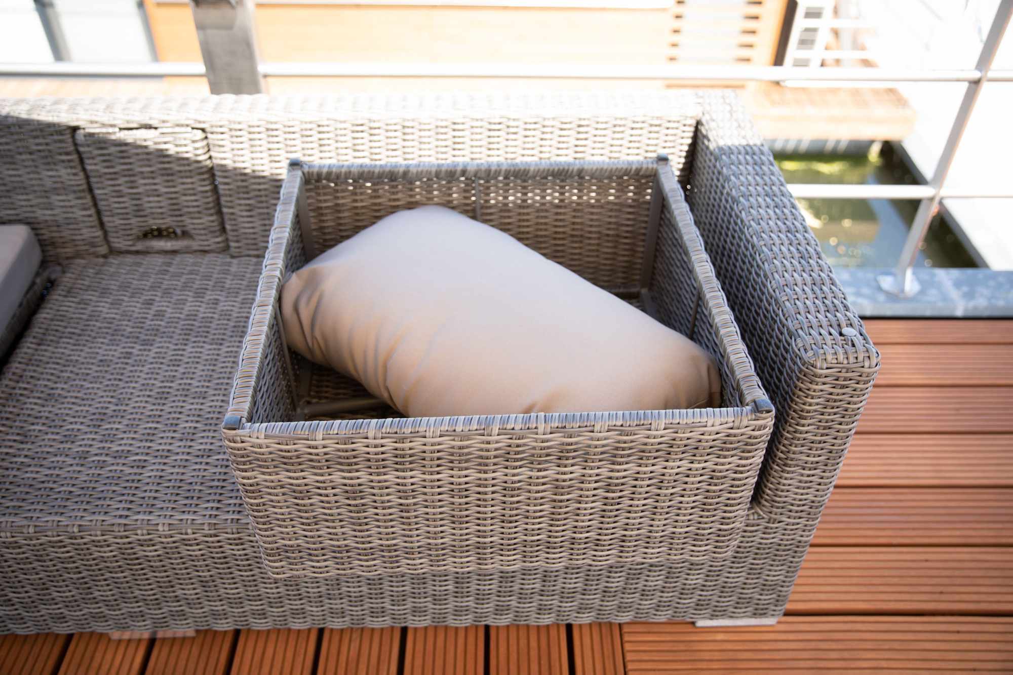 Zu allen Kategorien gehört eine 15 m² große Bugterrasse und eine 25 m² große Dachterrasse auf dem Oberdeck. Die Möblierung besteht aus einem Tisch mit vier Stühlen, zwei Gartenliegen mit Sonnendach, einem Beistelltisch und einem Sonnenschirm in festem Granitfuß. Liegen und Tischoberflächen sind auf das Gestaltungskonzept der jeweiligen Wohnkategorie abgestimmt. Die Dachterrassen sind zusätzlich mit Lounge-Möbeln und einem Sonnensegel ausgestattet.