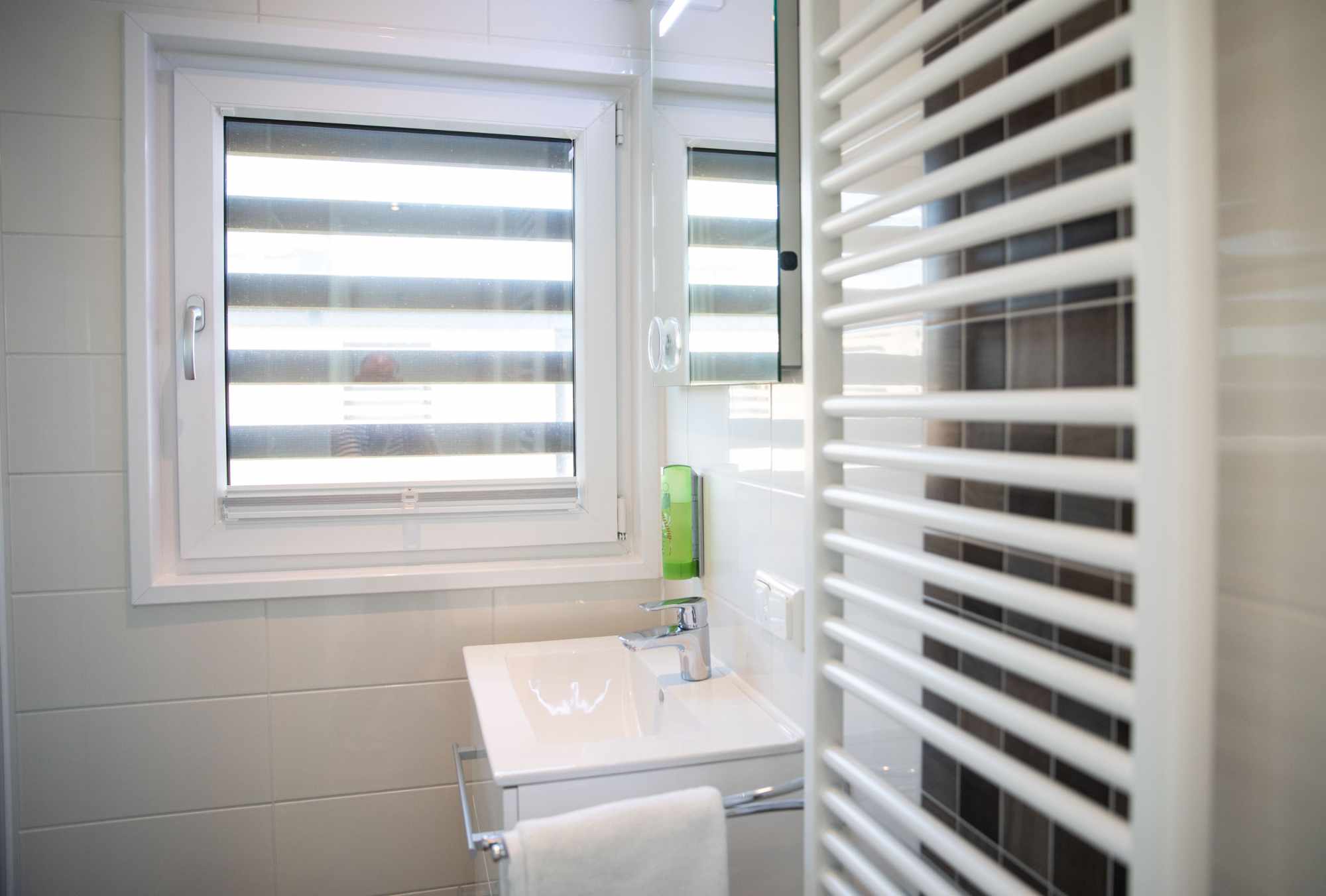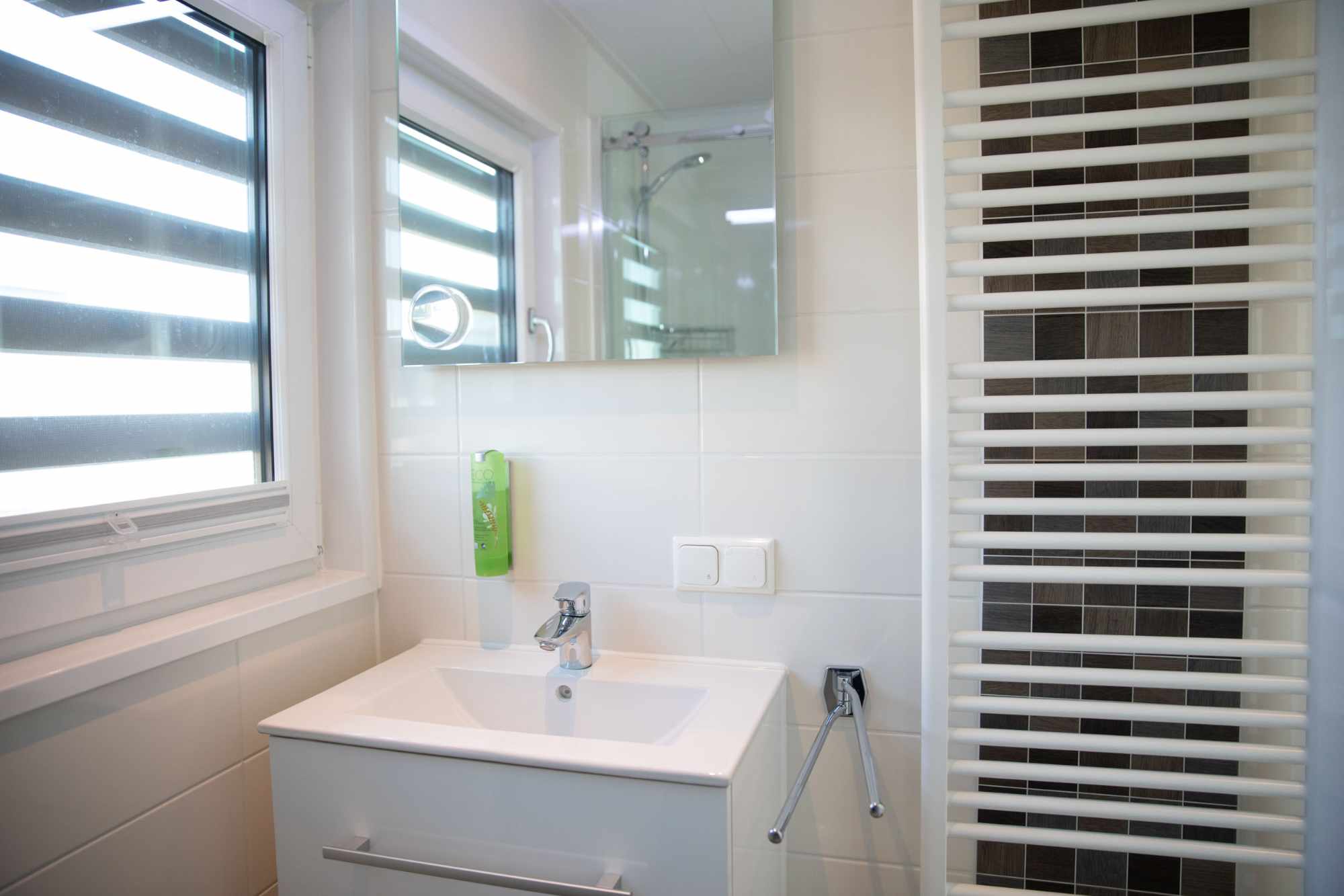 - Gefliestes Bad mit Duschkabine, Waschtisch, Spiegel, Fußbodenheizung und Handtuchheizkörper